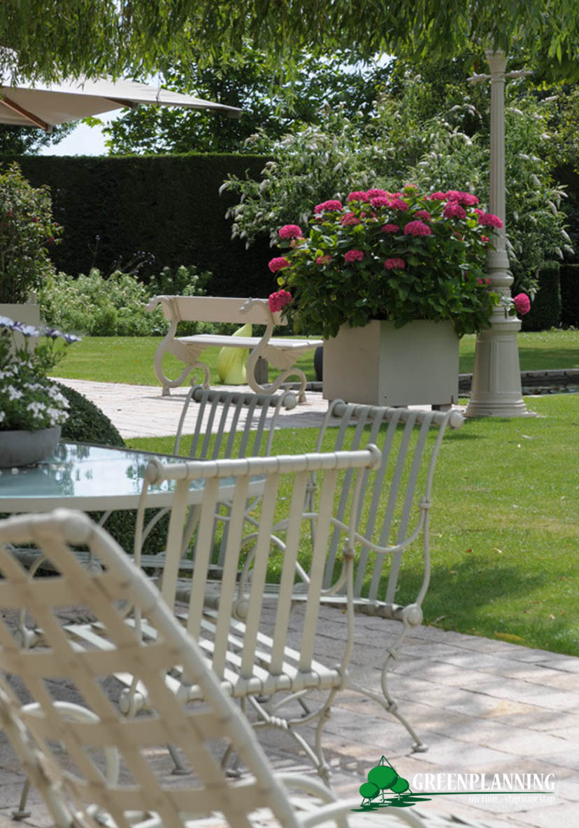 Als accent aan de ingang van de woning worden er vierkante potten geplaatst met grote Buxusbollen en een gietijzeren vaas als solitair met een Hydrangea macrophylla hybride.