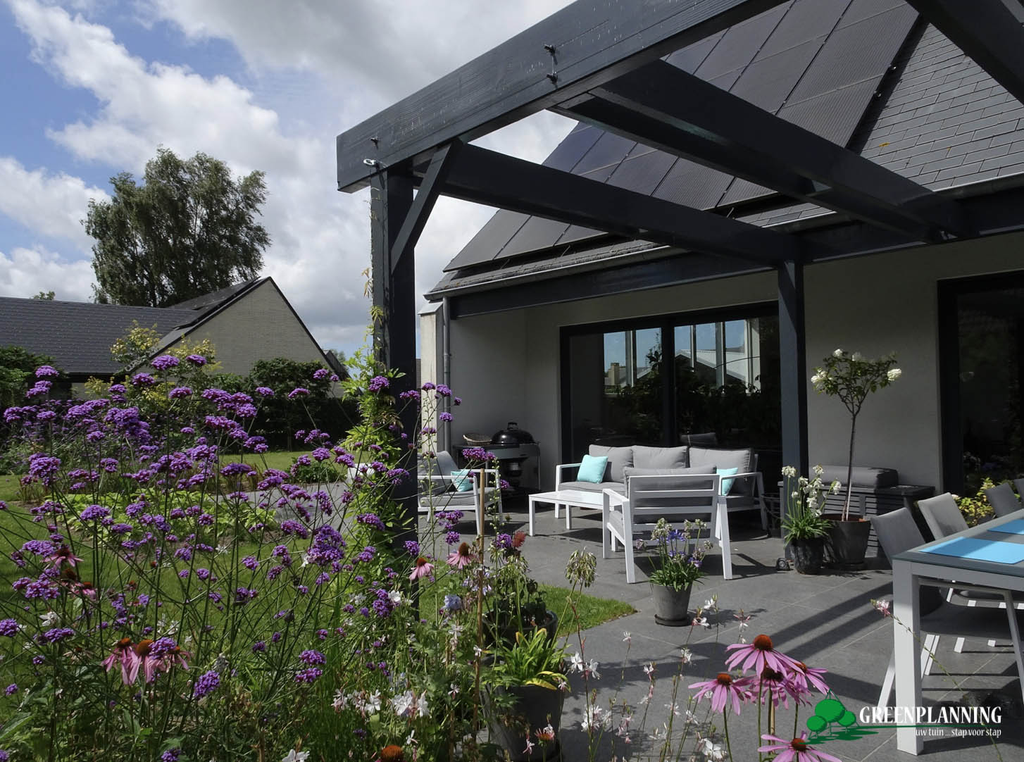 Om het bestaande, smalle zuidgerichte terras optisch te verlengen, is de uitbreiding haaks op het huidige gedeelte geplaatst. Door de natuursteentegels in de lengterichting te leggen, wordt dit diepte-effect extra benadrukt. Voor verkoeling tijdens hete zomerdagen is een pergola op maat ontworpen tussen de bestaande steunpilaren van de dakluifel. Door gebruik te maken van dezelfde houtsoort vormen de luifel en de pergola nu één architecturaal geheel.