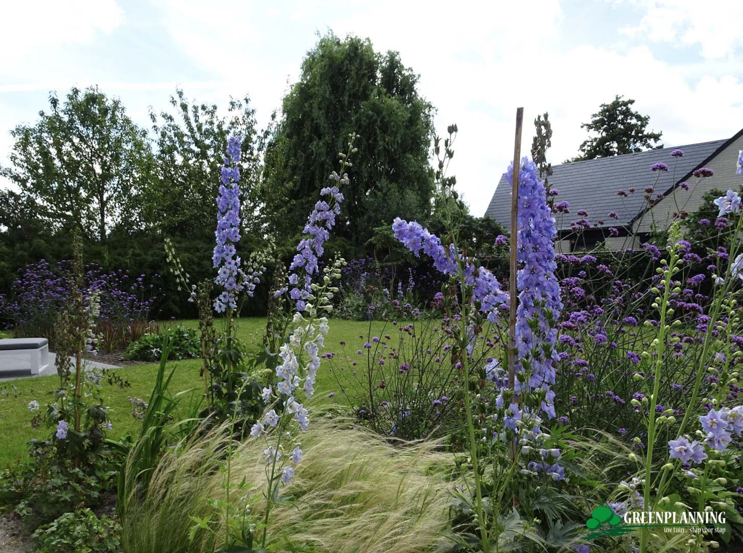 In de borders zorgen witte en paarse Riddersporen (Delphinium) samen met twee hopbeuken (Ostrya carpinifolia) voor verticale accenten die de hoge gevel van de woning verzachten. Lage siergrassen zoals Stipa en de roodkleurige Imperata 'Red Baron' zorgen voor dynamiek, terwijl hogere grassen zoals Molinia en Panicum een harmonieuze overgang vormen naar de bestaande bamboe. De paarse bloei van het IJzerhard (Verbena bonariensis) maakt het kleurenpalet compleet.