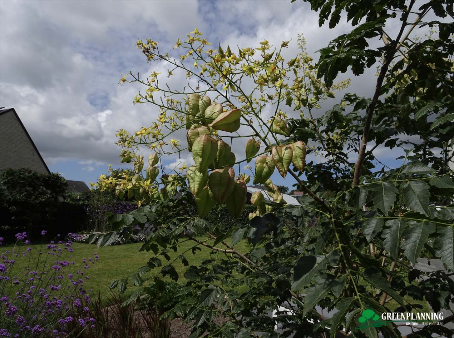 Vanwege de ondergrondse warmtebuizen zijn hoogstambomen op doordachte plaatsen geplant. Appelbomen in leivorm langs de perceelsgrens vormen met hun witte bloesems een prachtig contrast tegen de groene klimopwand.
