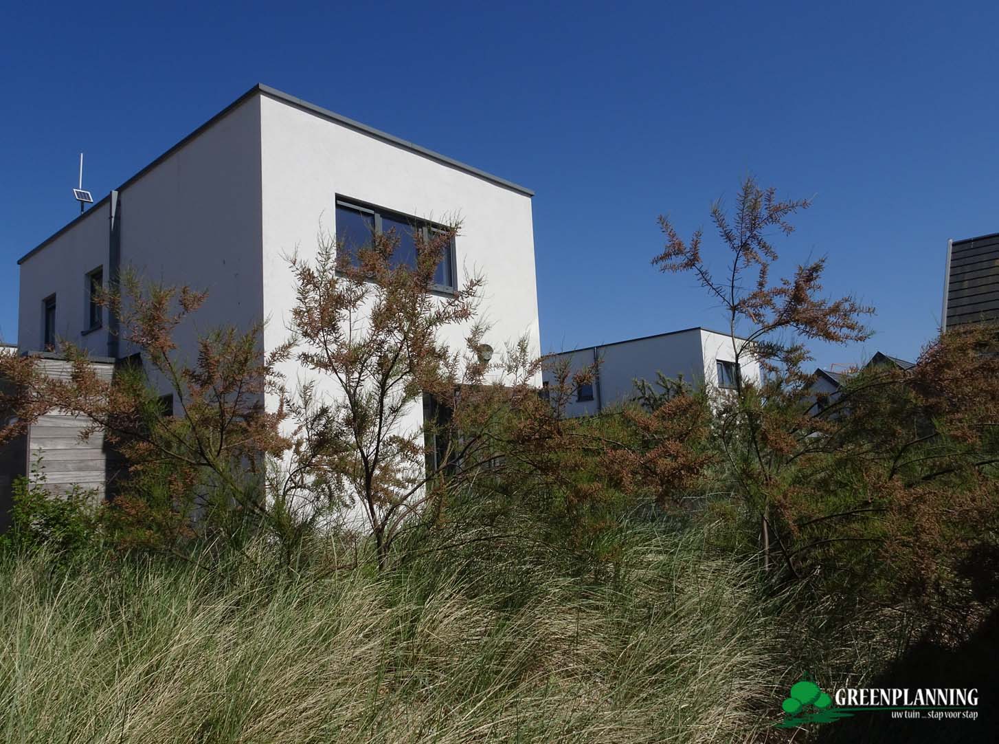 80% duinenbeplanting met – Amophylla arenaria – als accenten Pinus nigra “ Nigra “, Tamarix ramosissima, Hippohae rhamnoides, Salix repens.