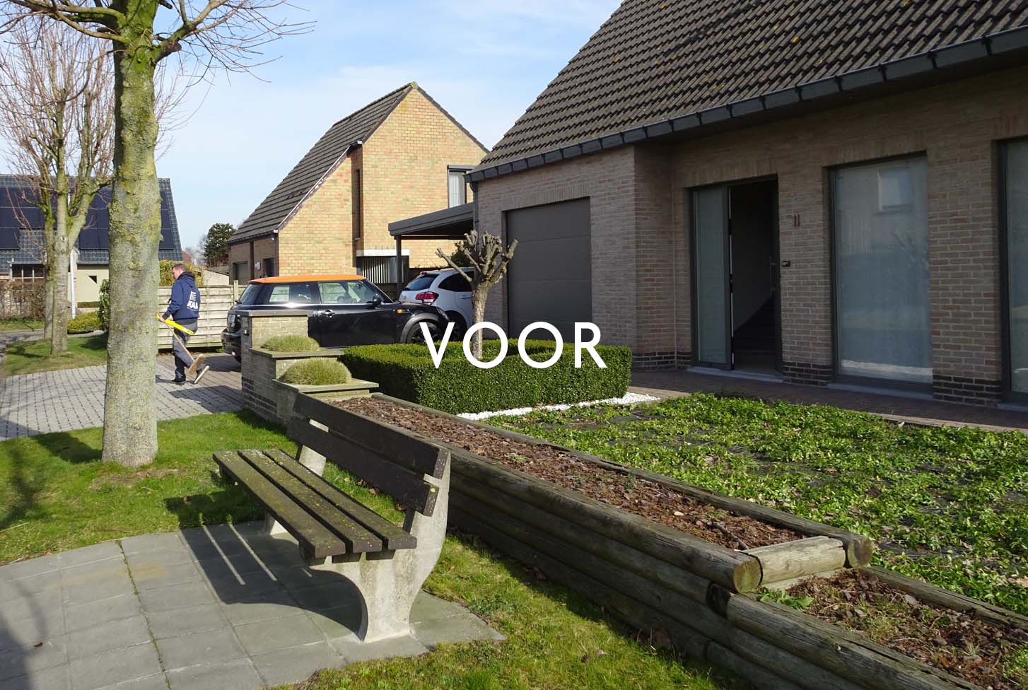 De tuin moest transformeren naar een persoonlijk permanent vakantieoord. Een plek om te genieten, tot rust te komen en de dagelijkse hectiek te vergeten. Een palmboom en siergrassen als basis, een windvrije zithoek en een praktische berging voor tuinmeubilair. Hoewel een strakke structuur gewenst was, werd er bewust niet gekozen voor klassieke hagen. Een essentieel element in het ontwerp was de integratie van een strak borrelelement, dat vanuit elke hoek van de woonkamer zichtbaar moest zijn. Daarnaast diende de voortuin over te vloeien in de publieke gazonstrook aan de straatzijde.