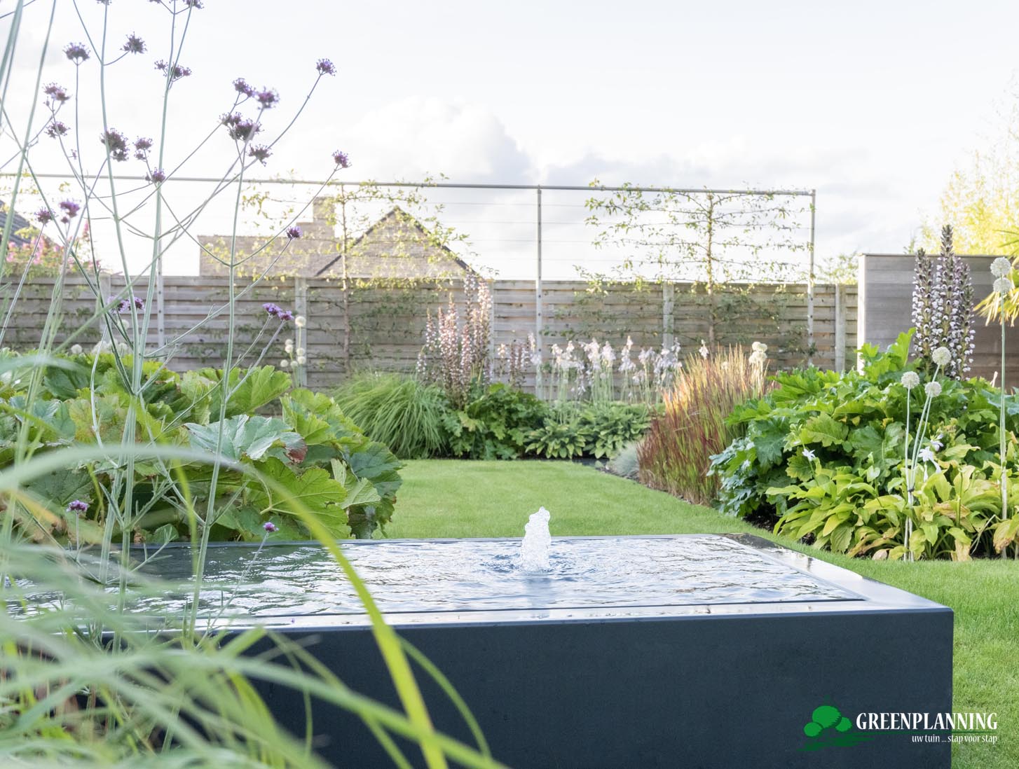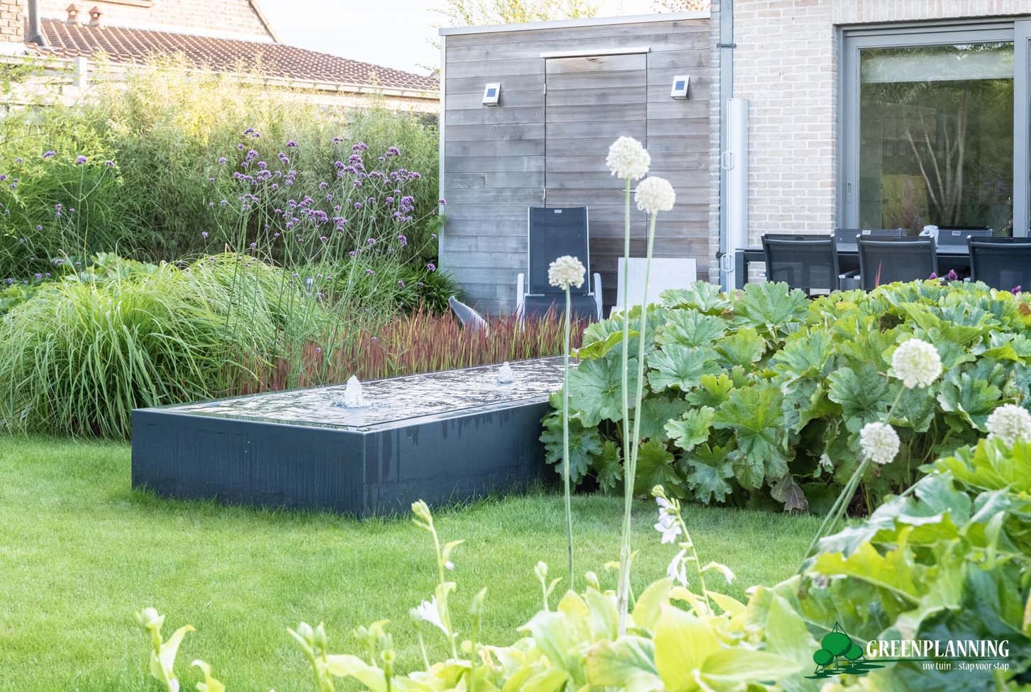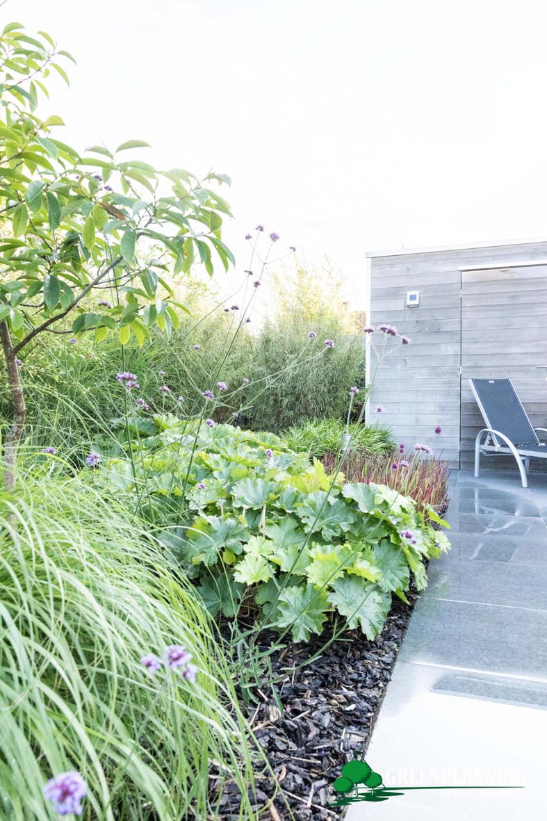 Om de brede, zuidoostelijk georiënteerde tuin visueel te verlengen, is een strakke, lange zwarte watertafel loodrecht op het hoofdterras geplaatst. Dit terras, uitgevoerd in grote donkergrijze keramische tegels, versterkt het ruimtelijke effect. Vanwege technische redenen bleef de bestaande vorm van het terras behouden, maar door de toevoeging van weelderige plantvakken is het getransformeerd tot een geborgen en intieme zithoek. Het dieprode Japans bloedgras (Imperata cylindrica 'Red Baron') vormt hierbij een levendig contrast met de robuuste bladplanten (Darmera peltata) en de strakke lijn van de watertafel.