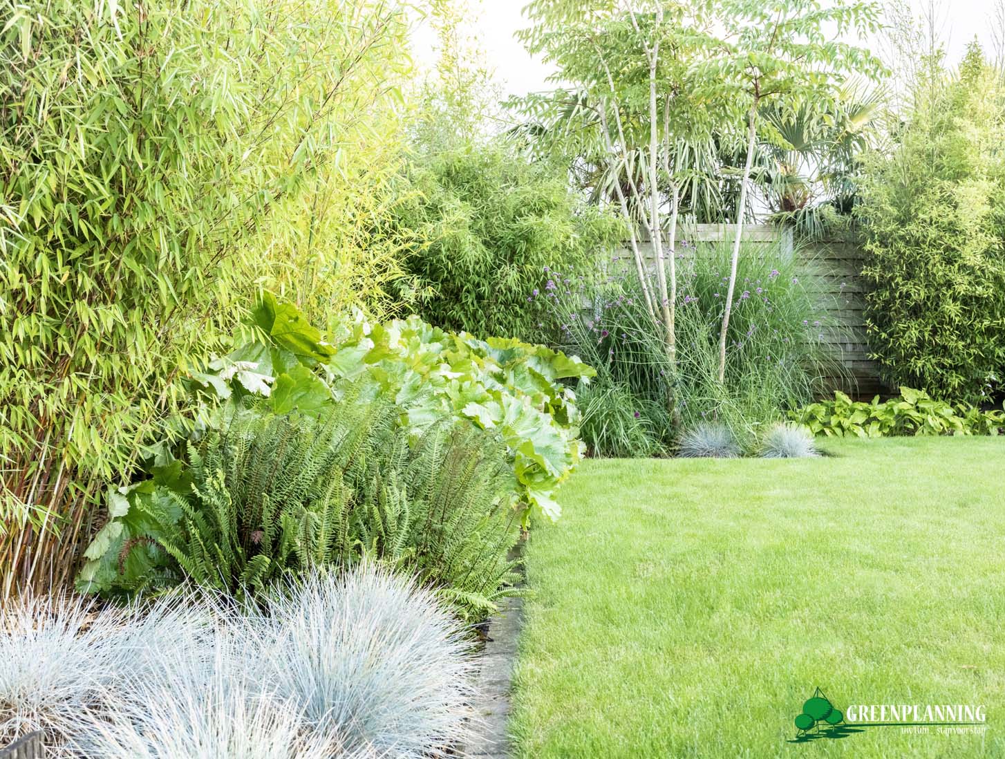 Een basis van siergrassen, bamboe en palmbomen, aangevuld met hergebruikte bestaande beplanting. (o.a. Magnolia en carex)
