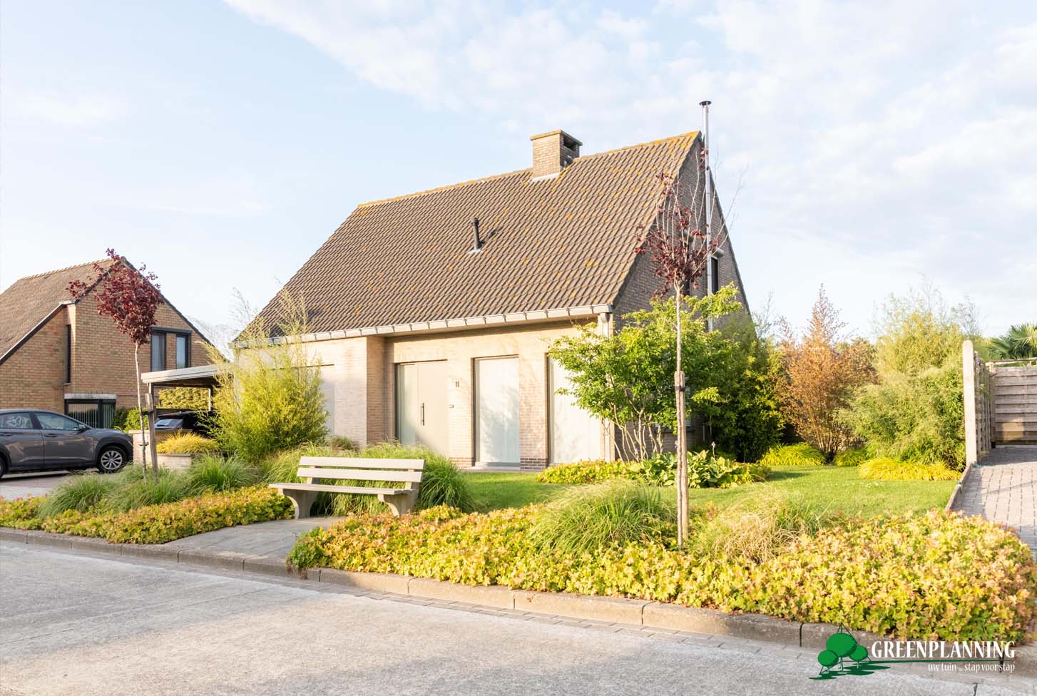 De voortuin ademt gastvrijheid; door het openbare gazon optisch bij de tuin te trekken, ontstaat een royaal ruimtegevoel. Leivormen van Malus “ Evereste “ en een natuurlijke wand van bamboe zorgen voor een groene omarming van het perceel, terwijl de geïntegreerde zitbank een warm contact houdt met de buurt.