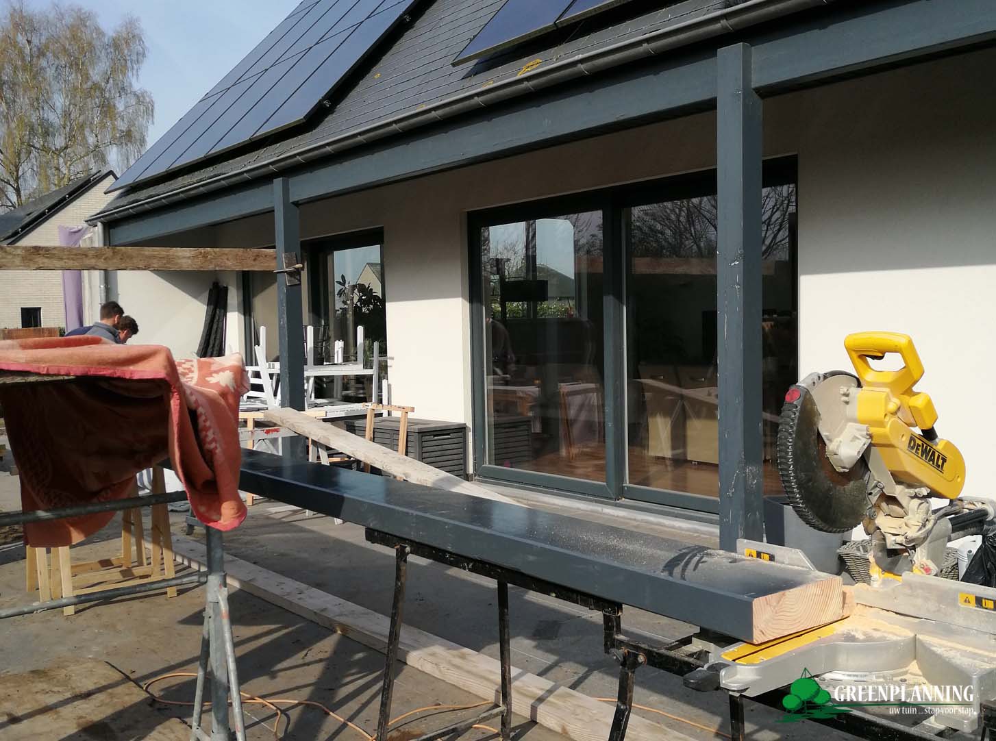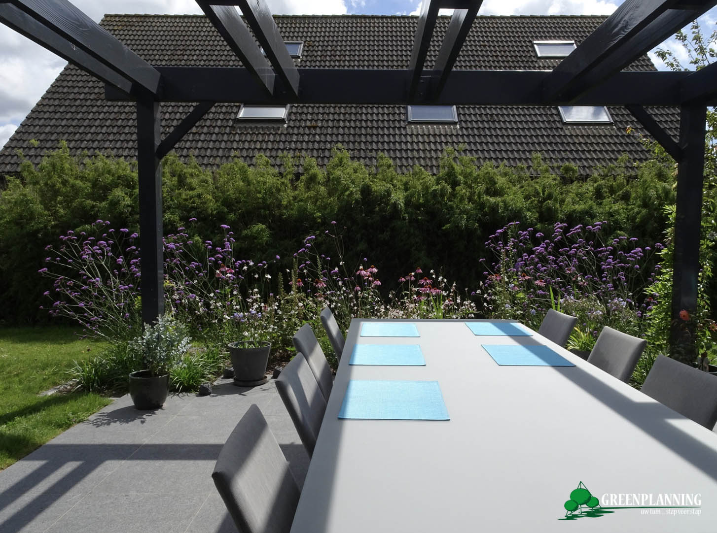 Om het bestaande, smalle zuidgerichte terras optisch te verlengen, is de uitbreiding haaks op het huidige gedeelte geplaatst. Door de natuursteentegels in de lengterichting te leggen, wordt dit diepte-effect extra benadrukt. Voor verkoeling tijdens hete zomerdagen is een pergola op maat ontworpen tussen de bestaande steunpilaren van de dakluifel. Door gebruik te maken van dezelfde houtsoort vormen de luifel en de pergola nu één architecturaal geheel.