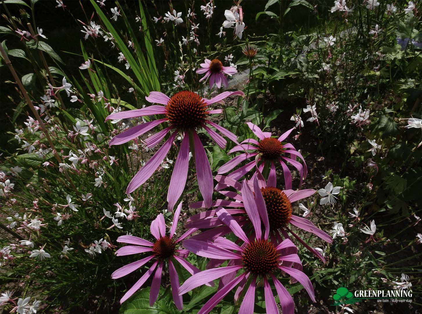 In de borders zorgen witte en paarse Riddersporen (Delphinium) samen met twee hopbeuken (Ostrya carpinifolia) voor verticale accenten die de hoge gevel van de woning verzachten. Lage siergrassen zoals Stipa en de roodkleurige Imperata 'Red Baron' zorgen voor dynamiek, terwijl hogere grassen zoals Molinia en Panicum een harmonieuze overgang vormen naar de bestaande bamboe. De paarse bloei van het IJzerhard (Verbena bonariensis) maakt het kleurenpalet compleet.