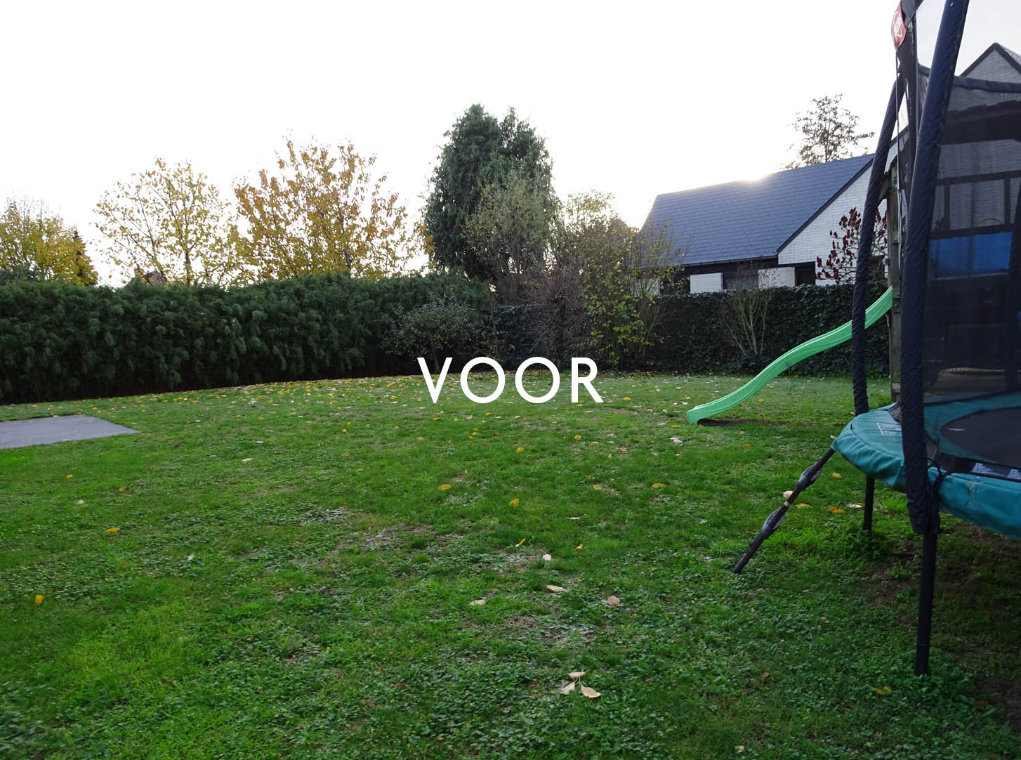 De trampoline is naar de zijkant van het perceel verplaatst, waardoor deze uit het zichtveld van de leefruimte is onttrokken.