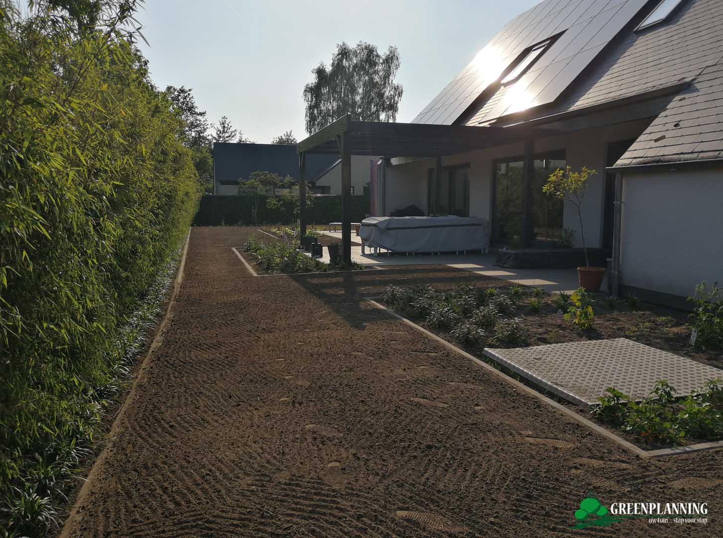 Wat direct opviel, was dat de grootste tuinoppervlakte zich aan de zijkant van de woning bevond. Om deze zones te verenigen, ontwierpen we een gazonpad langs de bestaande bamboehaag dat de leefruimte verbindt met de zijtuin.