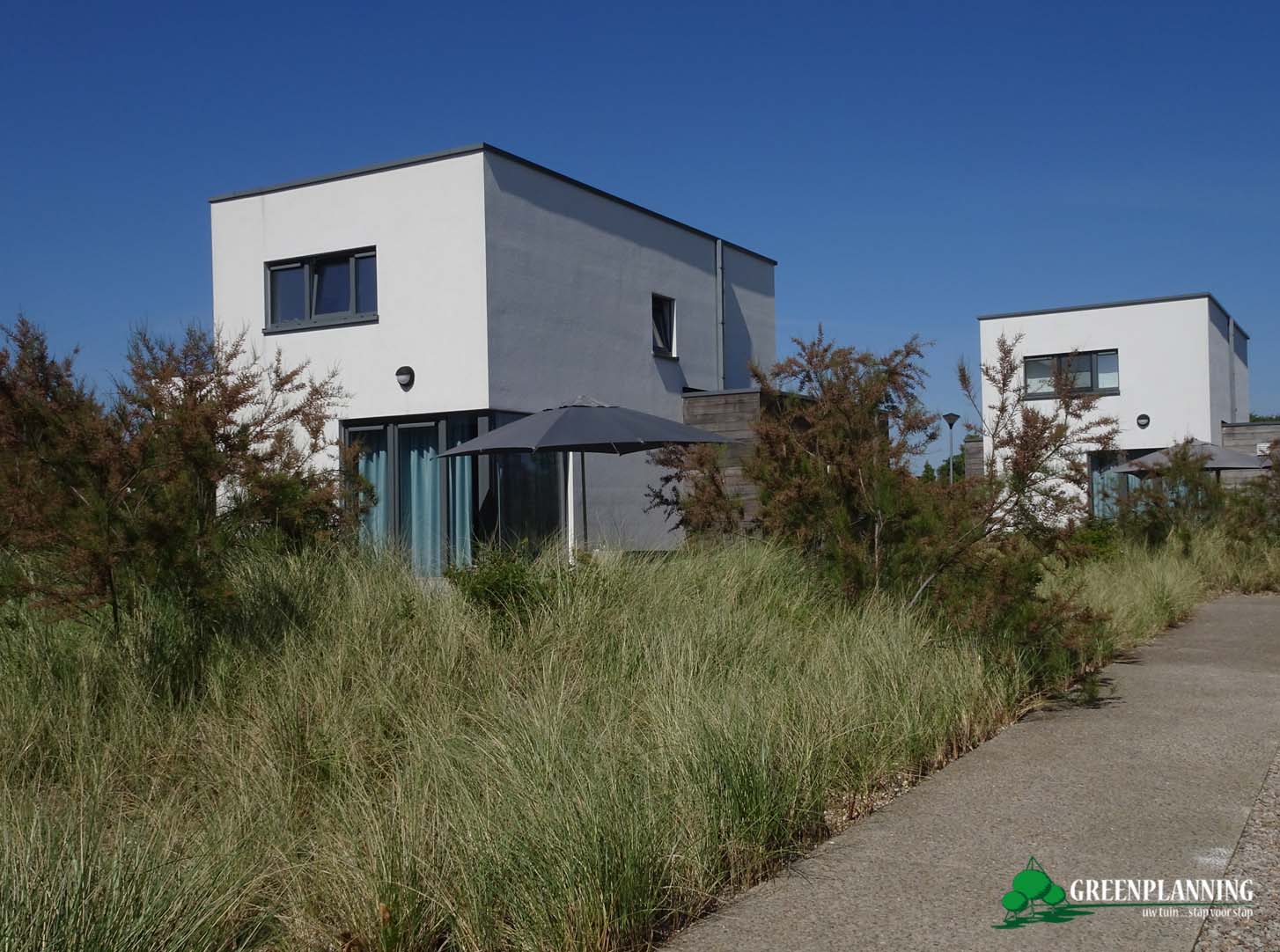 Om de beleving van duin, strand en zee te perfectioneren, zijn alle beplantingszones afgewerkt met een laag witte zeeschelpen. Dit voorkomt niet alleen verstuiving, maar zorgt ook voor die typische zilte sfeer tot aan uw voordeur. Verspreid over het domein vindt u diverse zithoeken waar u in alle rust kunt genieten van de streekeigen flora en fauna; een plek waar mens en natuur werkelijk centraal staan.