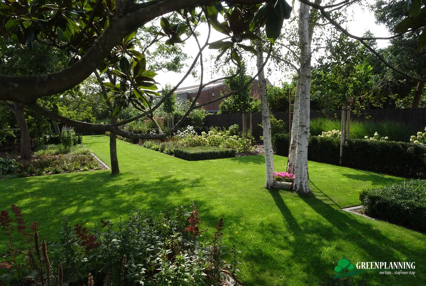De te behouden bomen — waaronder Juglans regia, Quercus robur, Tilia tomentosa, Betula pendula, de groenblijvende Magnolia grandiflora ‘Galissonniere’ en de Magnolia × soulangeana — bieden geborgenheid, schaduw en schoonheid. Vanwege hun grote emotionele waarde kregen zij een centrale plek, omringd door weelderige borders en de verplante buxus.