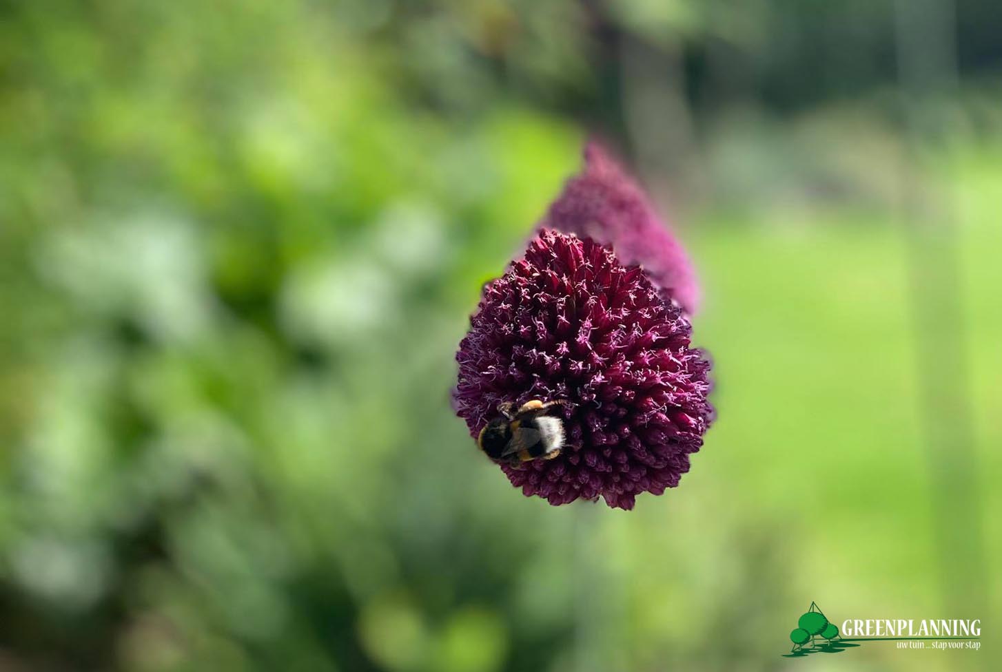 In het voorjaar zorgen witte Allium-bollen voor verticale accenten tussen het zwarte slangenbaardgras (Ophiopogon), wat het hele jaar door voor een boeiend schouwspel zorgt.