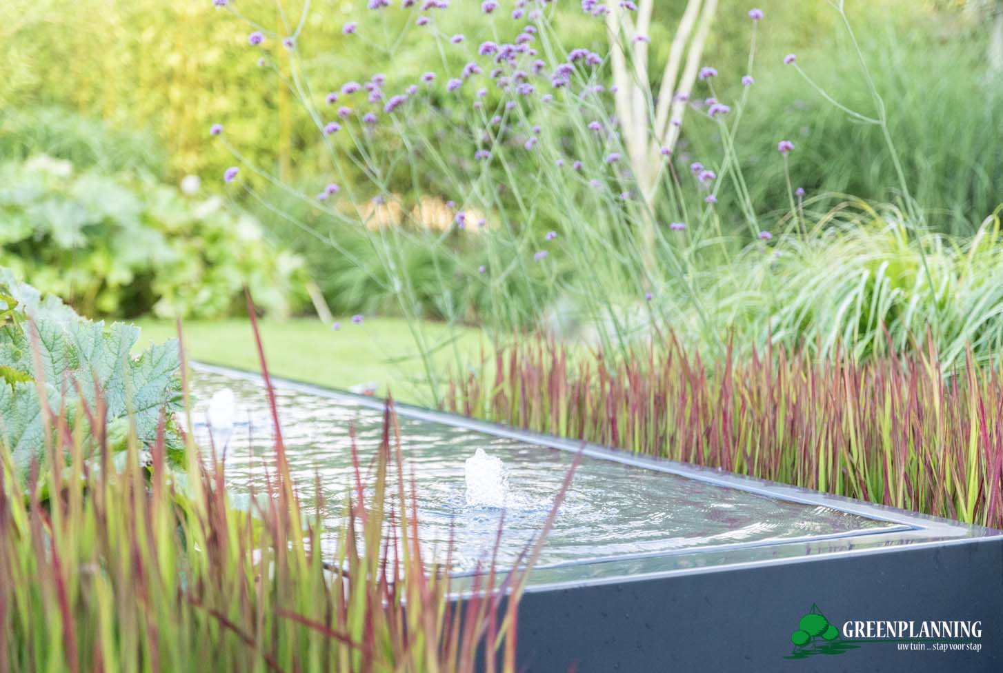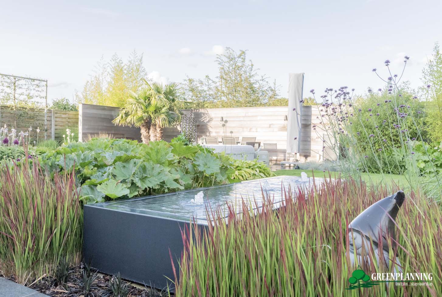 Om de brede, zuidoostelijk georiënteerde tuin visueel te verlengen, is een strakke, lange zwarte watertafel loodrecht op het hoofdterras geplaatst. Dit terras, uitgevoerd in grote donkergrijze keramische tegels, versterkt het ruimtelijke effect. Vanwege technische redenen bleef de bestaande vorm van het terras behouden, maar door de toevoeging van weelderige plantvakken is het getransformeerd tot een geborgen en intieme zithoek. Het dieprode Japans bloedgras (Imperata cylindrica 'Red Baron') vormt hierbij een levendig contrast met de robuuste bladplanten (Darmera peltata) en de strakke lijn van de watertafel.