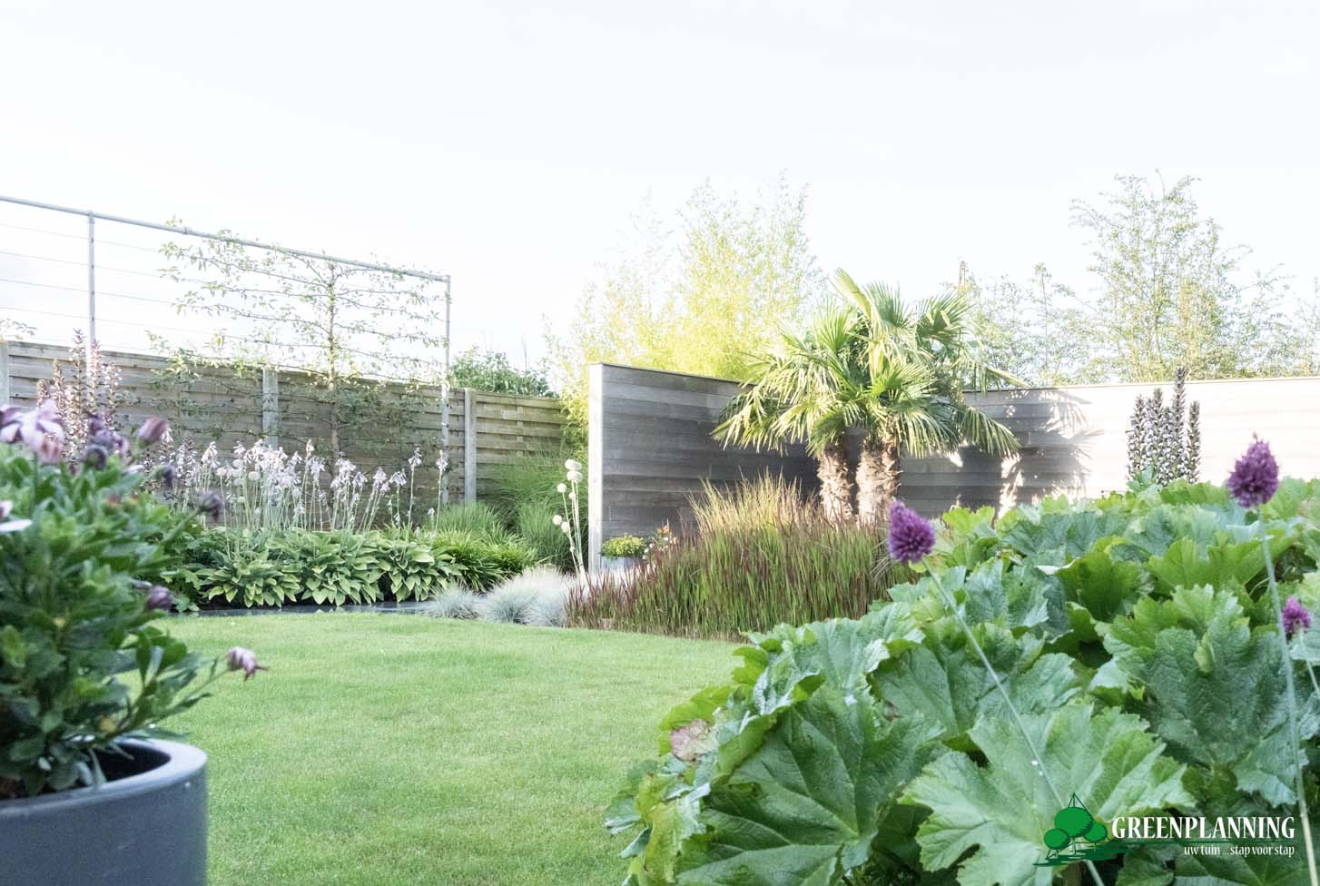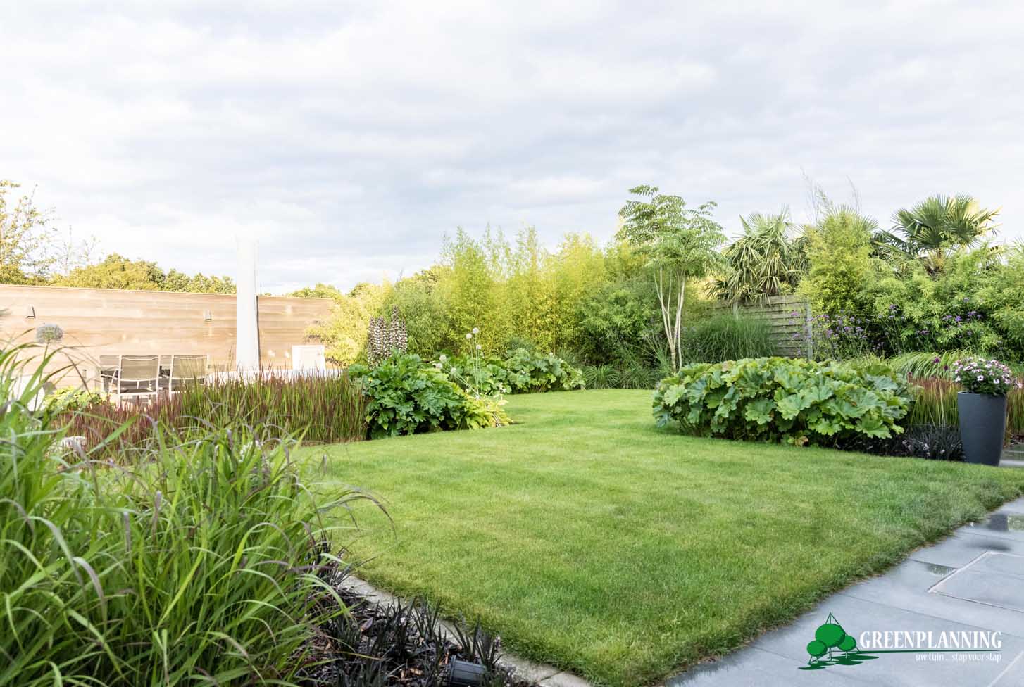 Een basis van siergrassen, bamboe en palmbomen, aangevuld met hergebruikte bestaande beplanting. (o.a. Magnolia en carex)
