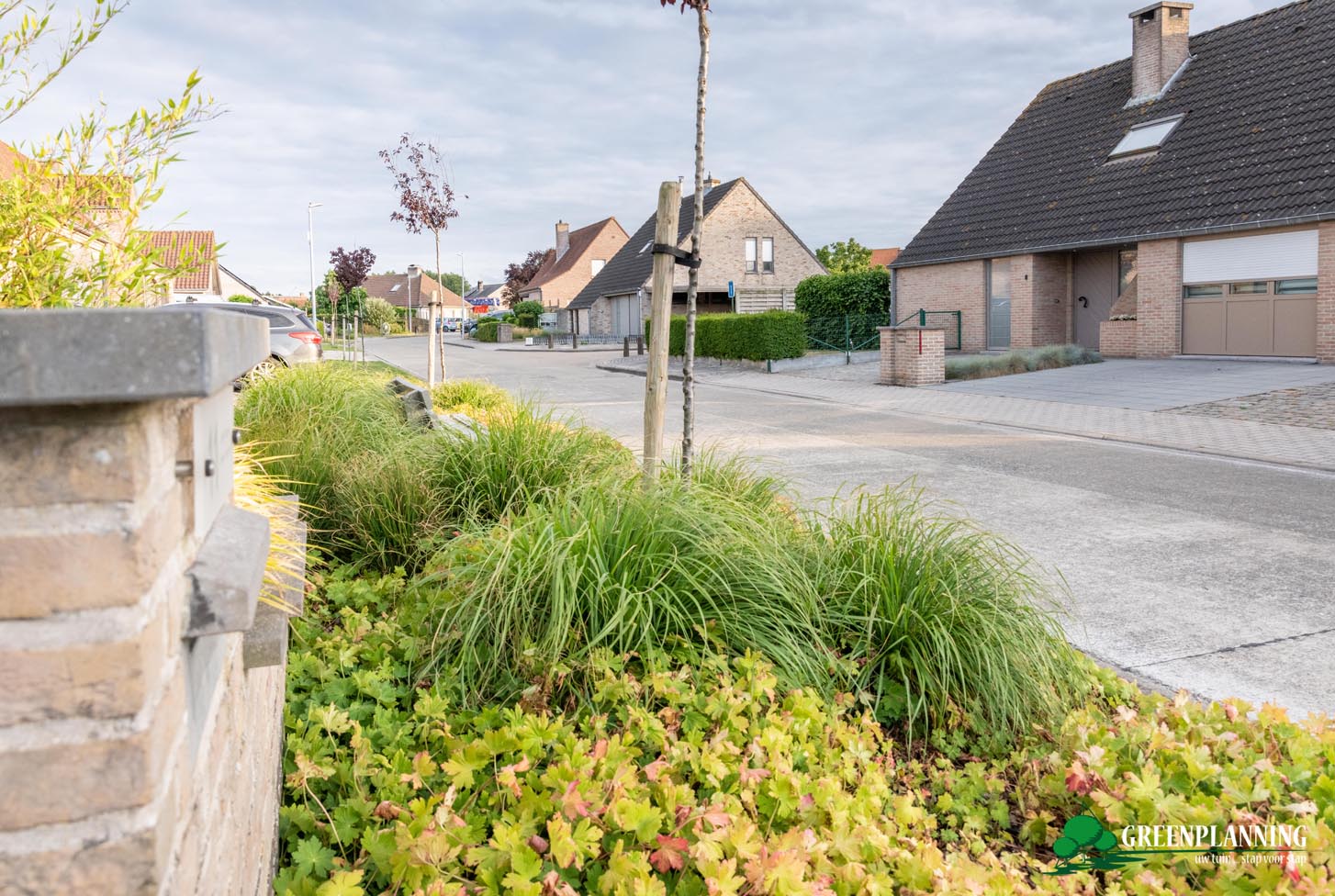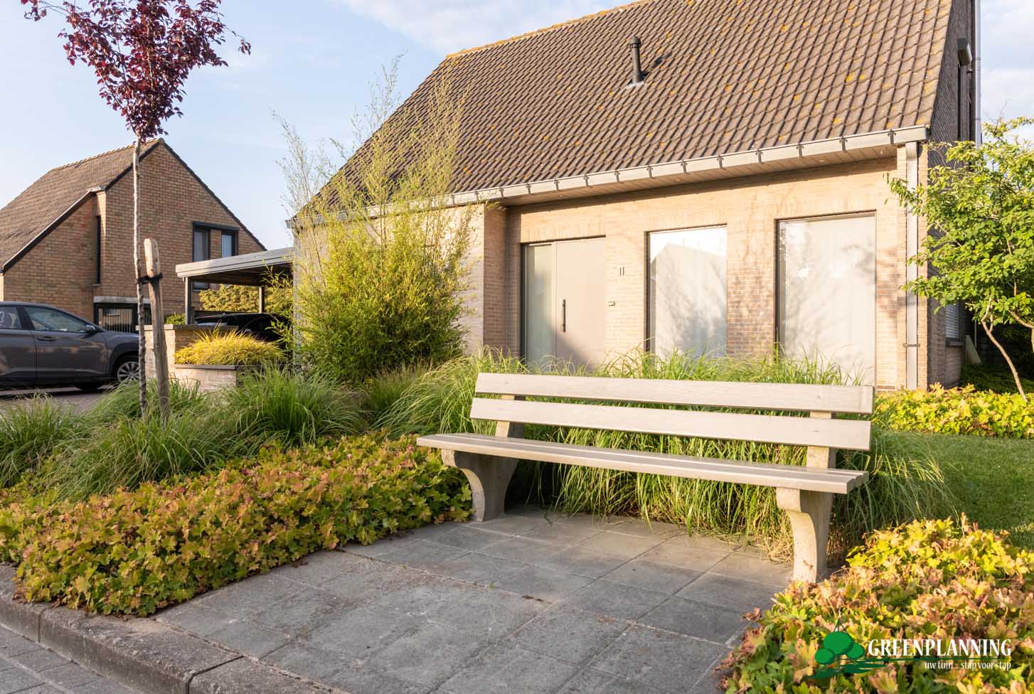 De voortuin ademt gastvrijheid; door het openbare gazon optisch bij de tuin te trekken, ontstaat een royaal ruimtegevoel. Leivormen van Malus “ Evereste “ en een natuurlijke wand van bamboe zorgen voor een groene omarming van het perceel, terwijl de geïntegreerde zitbank een warm contact houdt met de buurt.